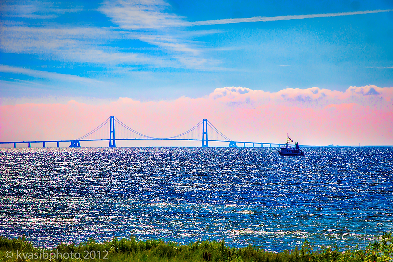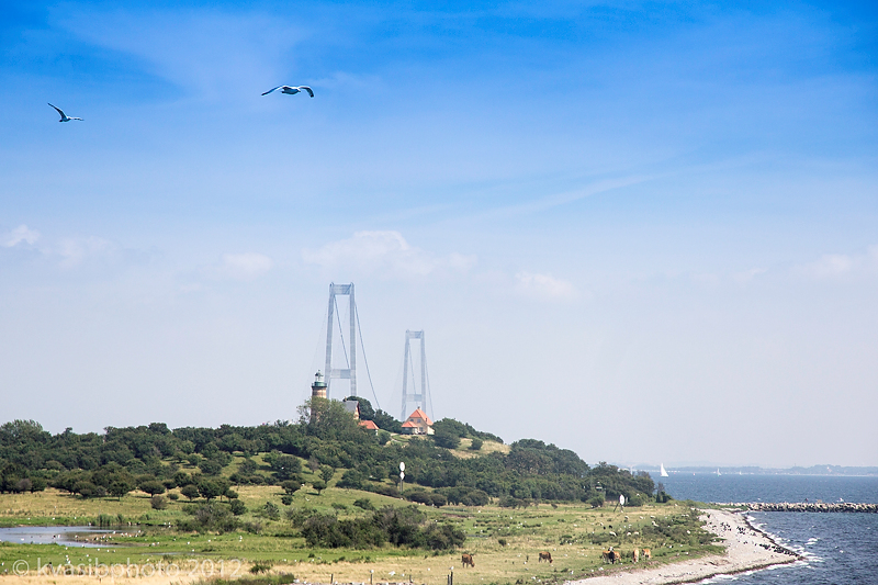 Nok av Jylland. Nå ville vi prøve Sjælland. Og over ditt var det en veldig lang bro. Blåste godt gjorde det også. Her var det tid for å fordele arbeidsoppgavene. Ottmari skulle svaie, noe hun har anlegg for med sin tre meters høyde,  jeg skulle klamre meg til rattet og Mikkel skulle forevige det hele med fotoapparatet. Og over kom vi på et vis.