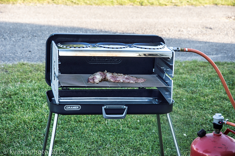 Sinsykt varmt hadde det rukket å bli før vi et par timer senere fant en virkelig fin campingplass. Lå skremmende, med tanke på Ottmaris drivstoffsbeholdning, ute i hutte heita. Men fin var den. Stor runde med is (med guf) og litt drikke til å skylle den ned med, før vi rigget opp den nye grillen for testbrenning av  kjøttstykker