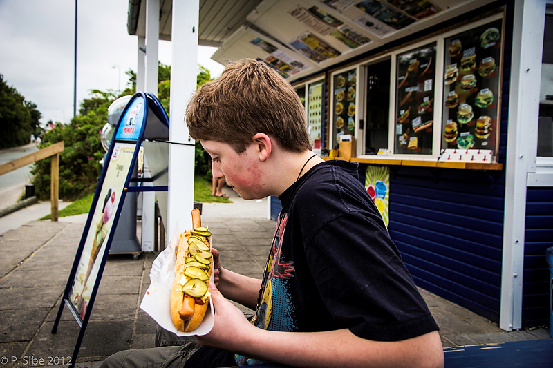 Kjempegode pølser og åpent hadde de. Nå er det vel en stund siden jeg ga opp å passe vekten, men kan jeg glede legen min så gjør jeg gjerne det. Og på dette pølsestedet kan jeg glede han ved å spise bare en pølse i brød. Her server de nemlig pølse på 50cm lengde, med nesten like langt brød og pyntet med agurk, remulade , rå og stekt løk holder det med en (til hver vel å merke). Pølse ble fortært og mette som bare det rullet vi ned på stranden for å fordøye dem og tørke remulade og løk av klærne. Dette et var gourmetmåltid av rang!